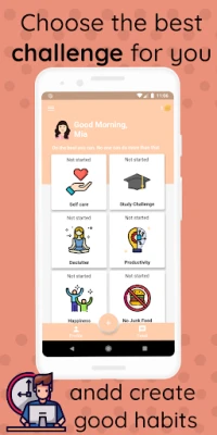 Từ việc khởi đầu một lối sống lành mạnh, tạm rời xa thế giới số, thực hành lòng biết ơn, hay học một ngôn ngữ mới, cho đến nâng cao năng suất, tìm kiếm hạnh phúc, tự học hỏi, phương pháp học tập hiệu quả, lan tỏa lòng tốt, cải thiện giấc ngủ, chăm sóc bản thân, sắp xếp lại cuộc sống, tăng cường tự tin, viết nhật ký hay khẳng định tích cực hàng ngày – vô vàn thử thách đang chờ bạn khám phá. Ứng dụng này đóng vai trò như một người bạn đồng hành, giúp bạn theo dõi và ghi nhận mọi tiến bộ trên hành trình hình thành thói quen.