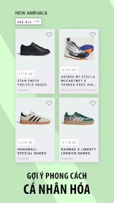 Khám phá bộ sưu tập phong phú dành cho mọi giới tính và lứa tuổi. Dù bạn tìm kiếm đôi giày chạy bộ tiên tiến để phá vỡ kỷ lục cá nhân, giày bóng đá chuyên nghiệp cho những trận đấu đỉnh cao, hay những thiết kế adidas Originals mang tính biểu tượng như Samba, Gazelle để khẳng định phong cách. Bên cạnh đó, ứng dụng còn giới thiệu đa dạng các loại trang phục từ áo thun, hoodie, quần jogger năng động đến các set đồ tập gym hiện đại và phụ kiện thể thao không thể thiếu, giúp bạn luôn tự tin và nổi bật trong mọi hoạt động.