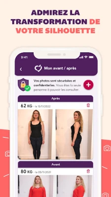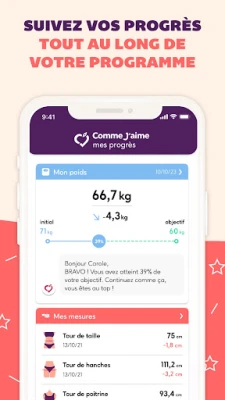 Ứng dụng COMME J'AIME đồng hành cùng bạn trong hành trình giảm cân và tái cân bằng dinh dưỡng. Theo dõi cân nặng, BMI, số đo cơ thể và đường cong giảm cân dự đoán. Thực hiện các hoạt động thể chất phù hợp, nhận nhắc nhở để xây dựng thói quen sống lành mạnh. Đây là sự hỗ trợ thiết yếu cho mục tiêu giảm cân của bạn.