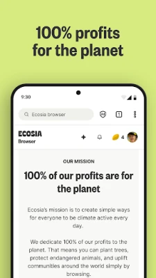 Tìm kiếm trên web cùng Ecosia: Search to plant trees để biến mỗi lần duyệt web thành hành động vì khí hậu. Ứng dụng này dùng 100% lợi nhuận quảng cáo để trồng cây, khôi phục cảnh quan và hỗ trợ cộng đồng. Ecosia tôn trọng quyền riêng tư của bạn và hoạt động bằng năng lượng mặt trời.